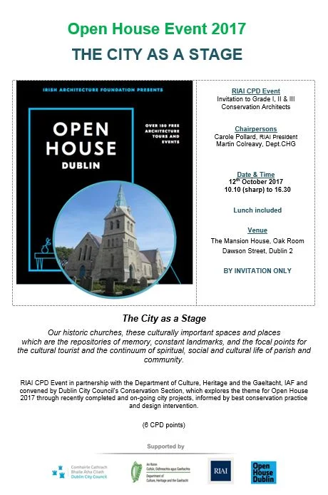 Gráinne Shaffrey will present at this Seminar 'The City as a Stage' on Thursday 12th October 2017. This is an RIAI CPD Event for Grade I, II & III Conservation Architects.