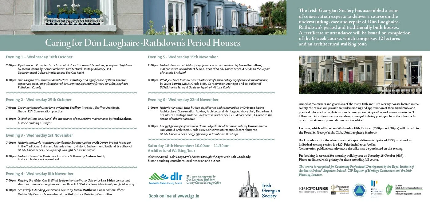 A 6-week evening conservation course presented by the Irish Georgian Society in association with Dún Laoghaire-Rathdown County Council in the Royal St. George Yacht Club from 7- 9.30pm on Wednesdays in October and November 2017.